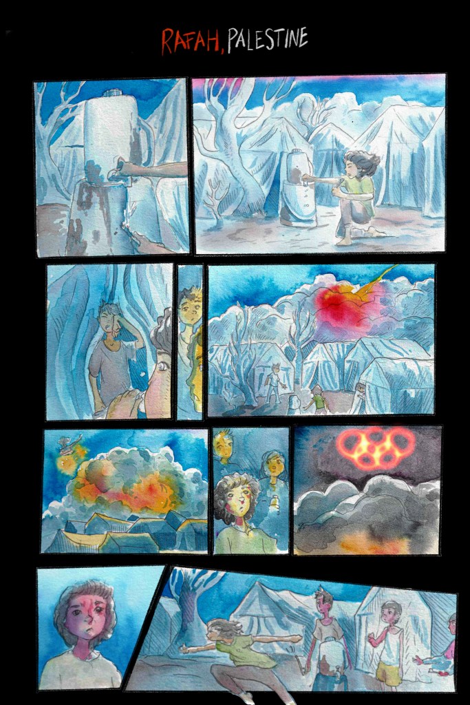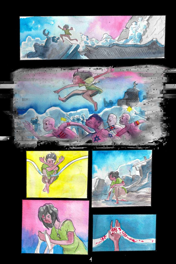 A short comic made in opposition to the 2024 Olympics and in solidarity with Palestinian youth targeted by the ongoing genocide in Gaza.